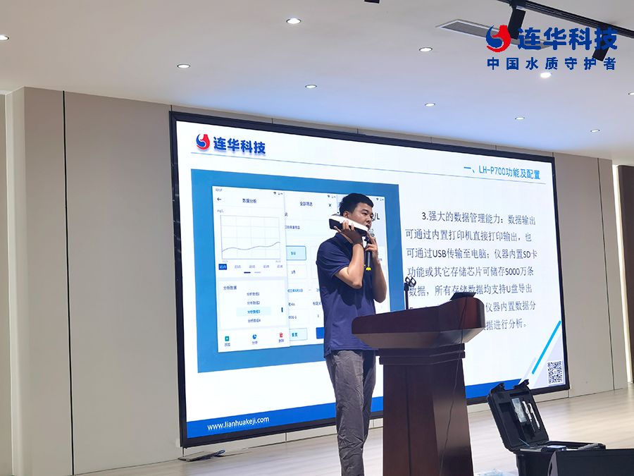 培訓(xùn)過程中,連華科技作為業(yè)內(nèi)知名的水質(zhì)檢測(cè)儀器及耗材生產(chǎn)廠家,對(duì)清瀾系列便攜式水質(zhì)測(cè)定儀LH-P700進(jìn)行了詳細(xì)的介紹和培訓(xùn)。上午的理論培訓(xùn)環(huán)節(jié),連華科技技術(shù)人員對(duì)水質(zhì)測(cè)定儀的原理、功能、常規(guī)污染指標(biāo)實(shí)驗(yàn)操作方法及注意事項(xiàng)進(jìn)行了全面系統(tǒng)的講解,讓參訓(xùn)人員對(duì)LH-P700這款水質(zhì)測(cè)定儀有了更加深入的了解。