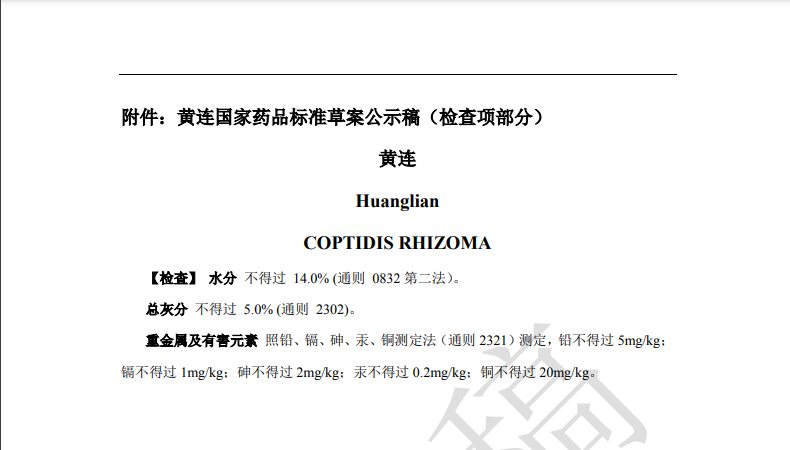 隨著《中藥法典》標(biāo)準(zhǔn)修訂進(jìn)程的推進(jìn),藥典委官網(wǎng)近期陸續(xù)發(fā)布多個(gè)標(biāo)準(zhǔn)公示,均與中藥重金屬及有害元素控制相關(guān)。其中,“關(guān)于黃連國(guó)家藥品標(biāo)準(zhǔn)草案的公示”、“關(guān)于艾葉國(guó)家藥品標(biāo)準(zhǔn)草案的公示”、“關(guān)于川芎國(guó)家藥品標(biāo)準(zhǔn)草案的公示”,對(duì)相關(guān)檢測(cè)項(xiàng)擬進(jìn)行修訂。公示期為30天。通知表示,若有異議,可及時(shí)在線反饋,并附相關(guān)說(shuō)明、實(shí)驗(yàn)數(shù)據(jù)和聯(lián)系方式。