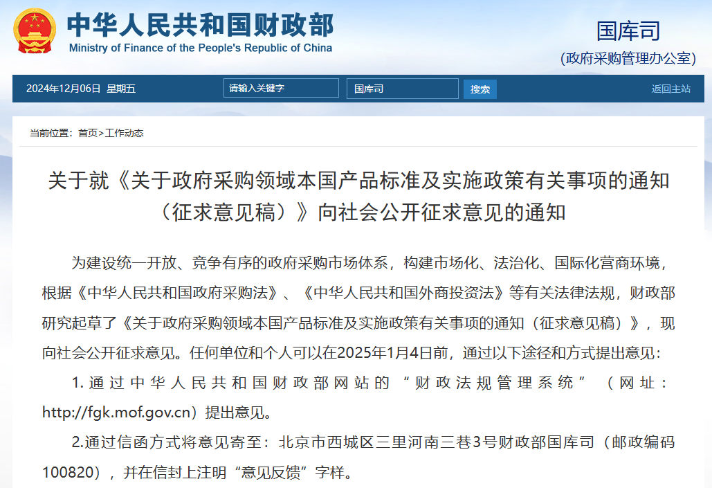 近日,財政部在其官方網(wǎng)站上發(fā)布了《關于政府采購領域本國產(chǎn)品標準及實施政策有關事項的通知(征求意見稿)》,并向社會各界公開征求意見。該通知旨在構建統(tǒng)一開放、競爭有序的政府采購市場體系,保障各類經(jīng)營主體平等參與政府采購活動,并明確提出在政府采購活動中,給予本國產(chǎn)品相對于非本國產(chǎn)品20%的價格評審優(yōu)惠。