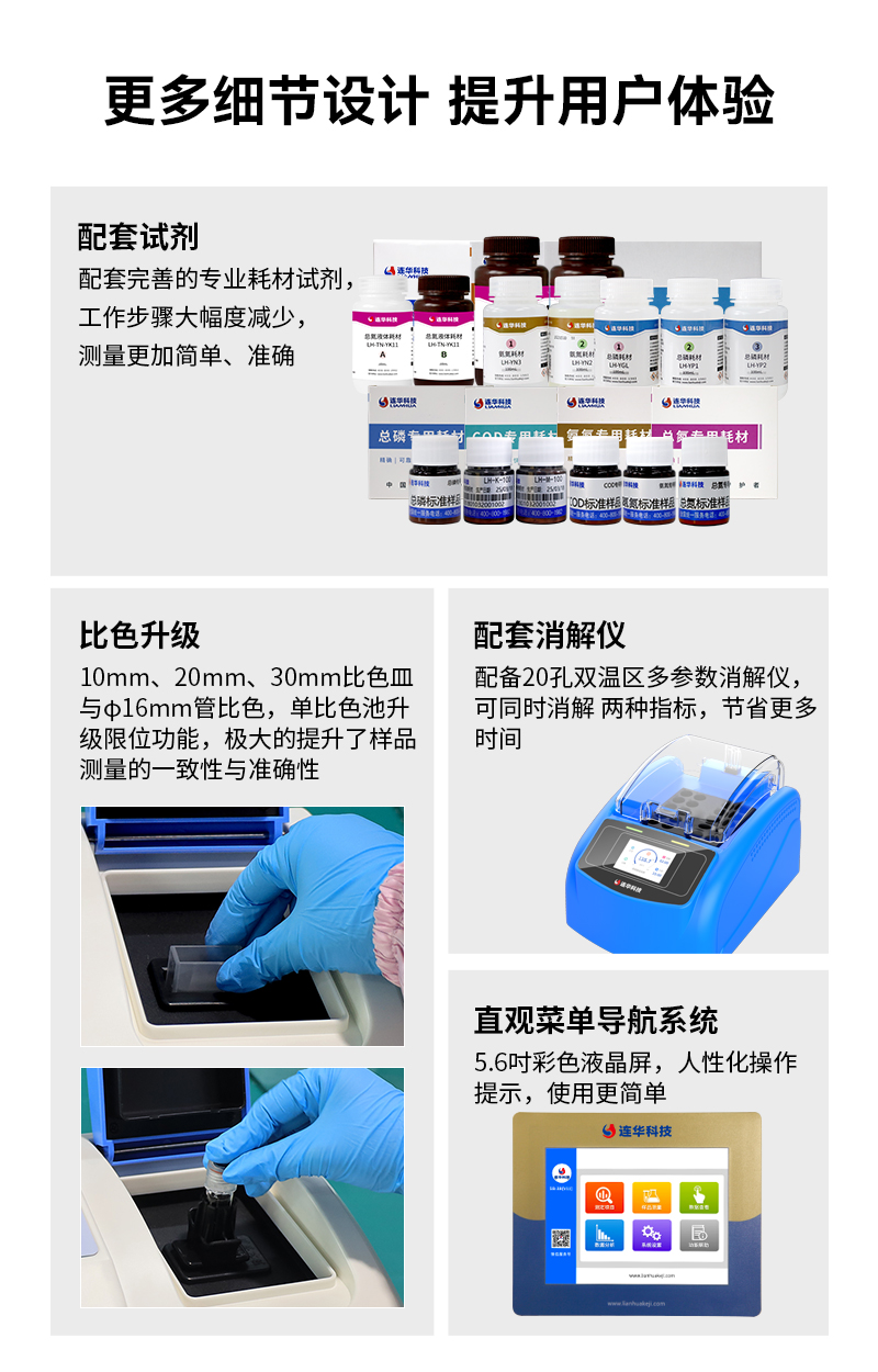 2、標配消解儀:標配20孔雙溫區多參數消解儀(可選配),可同時消解兩種指標不同溫度水樣,并可滿足用戶大批次樣品檢測的需求,節省時間;