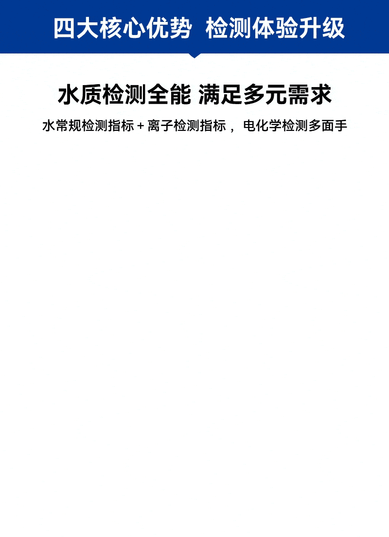 1、手持式迷你主機,支持pH、溶解氧、電導率、鹽度、ORP、TDS、SAL、溫度8項指標及氟、氯、溴、碘、鈣、鉀、鈉、硝酸根、銨根等離子快速 檢測,滿足各領(lǐng)域水質(zhì)檢測需求;